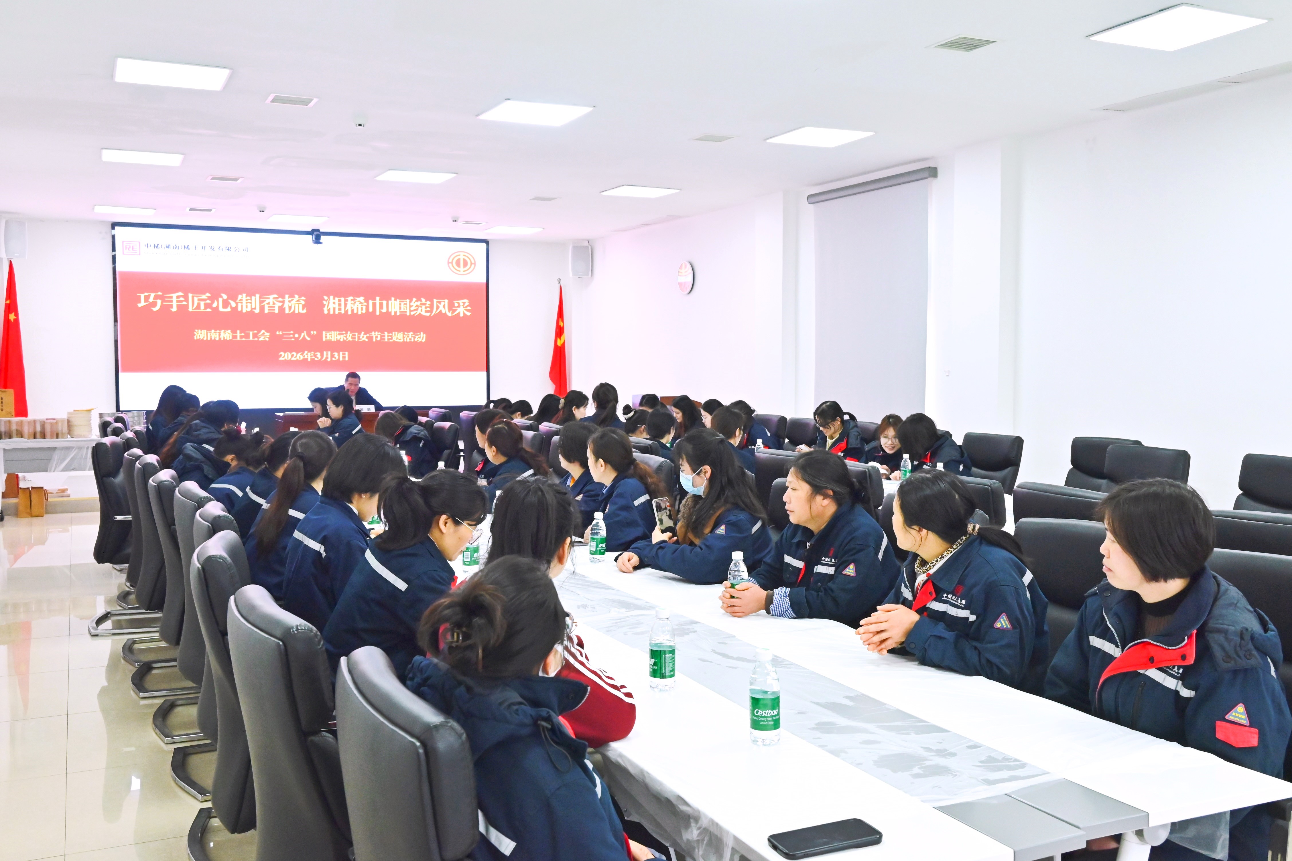为弘扬中华优秀传统文化,丰富女职工精神文化生活,展现新时代稀土女性风采,3月3日,由湖南稀土党委主办、工会承办的“巧手匠心制香梳 湘稀巾帼绽风采”庆祝三八国际妇女节主题活动在公司本部举行。公司40余名女职工欢聚一堂,在非遗文化的浸润中,共同迎接第116个三八国际妇女节的到来。