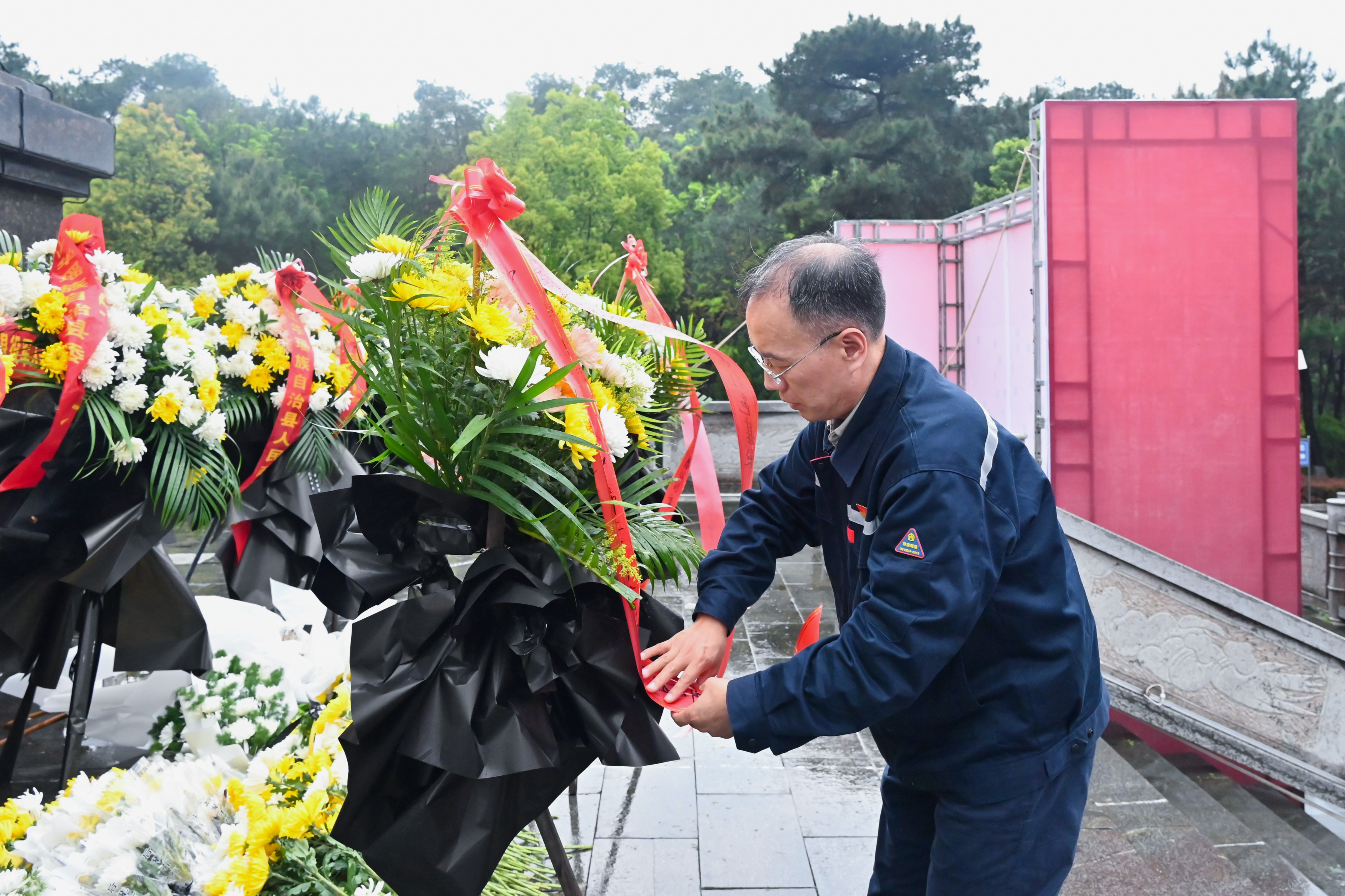 烈士纪念碑前,全体人员整齐列队、肃立默哀。党员代表向革命烈士敬献花篮,公司党委副书记、董事、总经理徐建新上前仔细整理花篮缎带,向为民族解放、国家安定英勇献身的先烈致以崇高敬意。