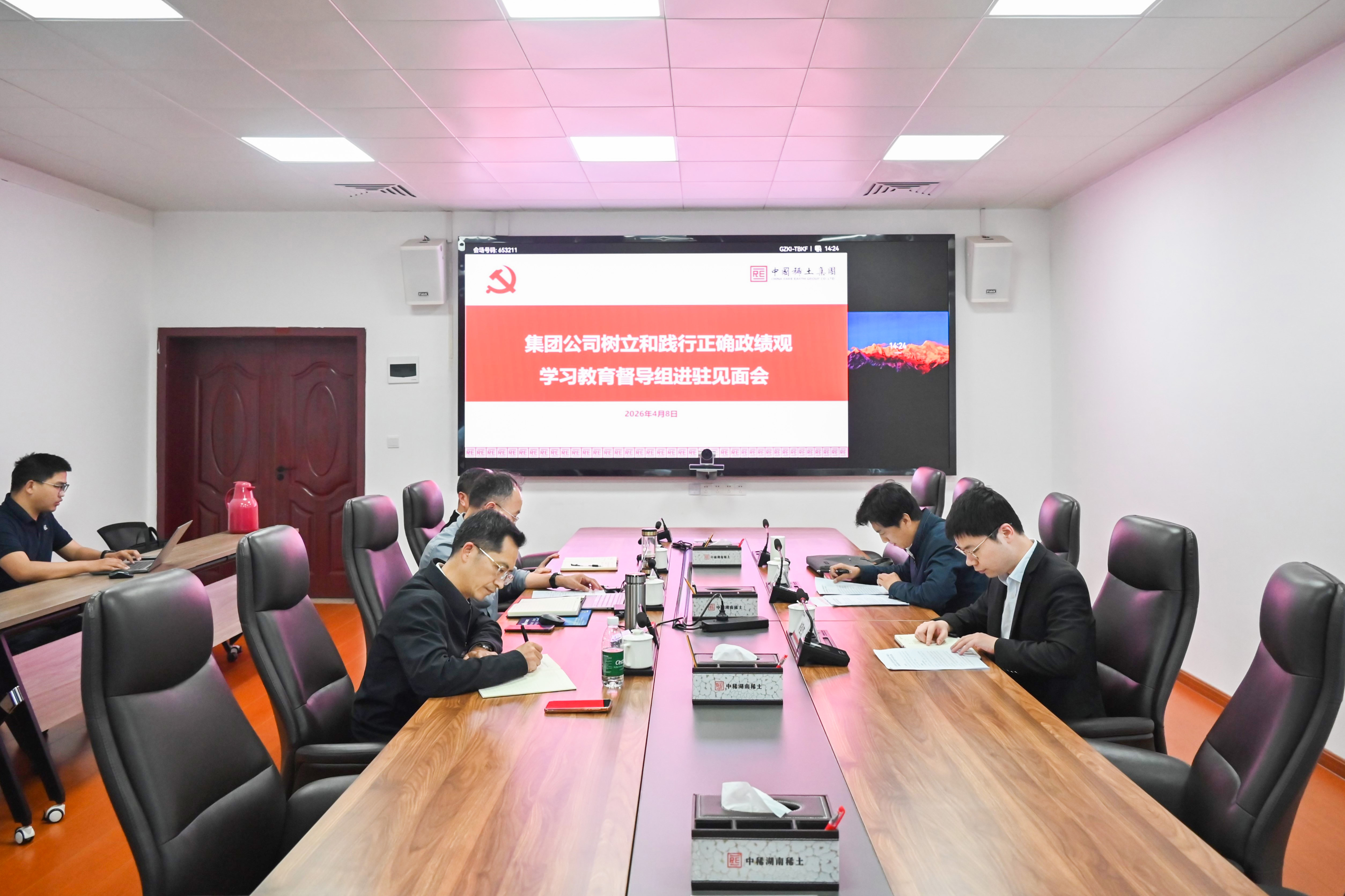 4月8日,根据中国稀土集团党委统一部署,集团公司党委树立和践行正确政绩观学习教育督导组一行进驻公司并召开见面会。公司党委副书记、董事、总经理徐建新主持会议,汇报公司学习教育进展情况并作表态发言,在家领导班子成员、学习教育工作专班成员参加会议。